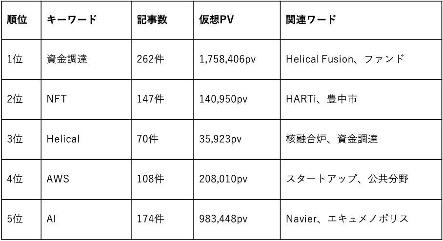 1位には、スタートアップの大規模資金調達の発表と、日本初のスタートアップ向けデットファンドを立ち上げたVCの発表により「資金調達」というワードがトレンド入りしました。2位は先月に続き「NFT」関連がランクイン。愛知県豊中市が協働実験「Urban Innovation TOYONAKA」で、NFTを利用したクリエイターの支援などへ参加するスタートアップ企業の募集を開始した記事によるものや、人気NFT作品のアニメ化プロジェクト等に取り組む企業がマイクロソフト社のスタートアップ向け支援プログラムに採択されたニュースが話題となりました。3位の「Helical」は、新エネルギーとして注目のヘリカル型核融合炉の開発を目指すスタートアップが資金調達を実施したことによるものです。4位の「AWS」はスタートアップを支援するアマゾン ウェブ サービスのプログラム「AWS Startup Ramp」に参加した多数の企業の発表が記事となりました。