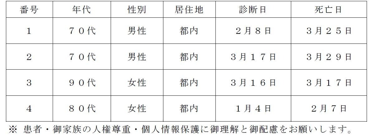 新型コロナウイルスに関連した患者の死亡について business Twitter Facebook はてブ Pocket LINE コピー 2023.03.30 この記事は約1分で読めます。 都内で新型コロナウイルスに感染した方が死亡されましたのでお知らせします。 お亡くなりになった方のご冥福をお祈り申し上げます。 1 新型コロナウイルスに関連した死亡者(本日公表分) 2 新型コロナウイルスに関連した死亡者の累計 8,061人