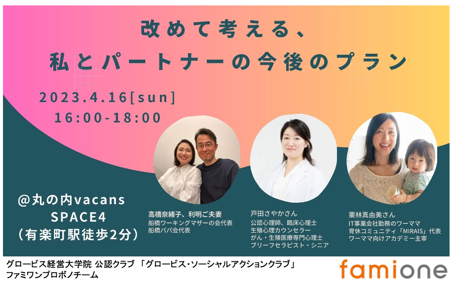 今回、ファミワンのプロボノチームとの共催で、「改めて考える、私とパートナーの今後のプラン」~先輩・専門家に学ぶこれからの人生の課題解決のヒント~ と題し、妊活をはじめとするキャリアプランニングにおけるパートナーとのコミュニケーションをテーマにセミナーを開催致します。 https://famione-probono.peatix.com/view