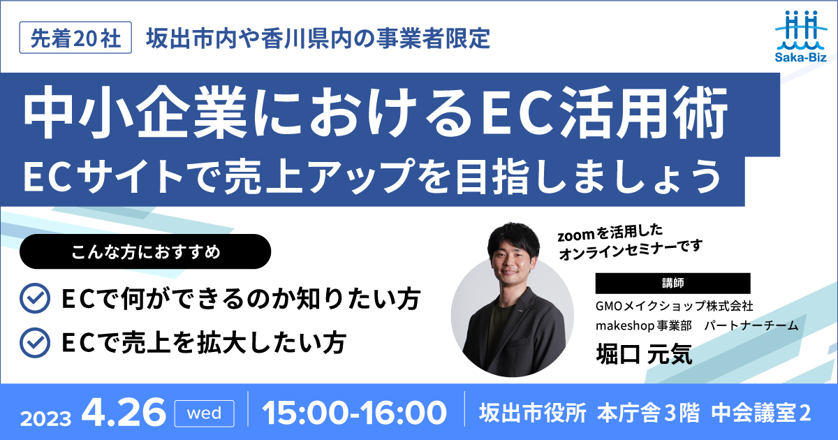 4月26日(水)には、GMOメイクショップとSaka-Biz共催による第1回目のセミナーを実施いたします。第1回目のセミナーでは「中小企業におけるEC活用術」をテーマに、ECサイトを立ち上げるメリットや、ECサイトを活用した販路拡大の方法など事例を交えて分かりやすくお届けいたします。