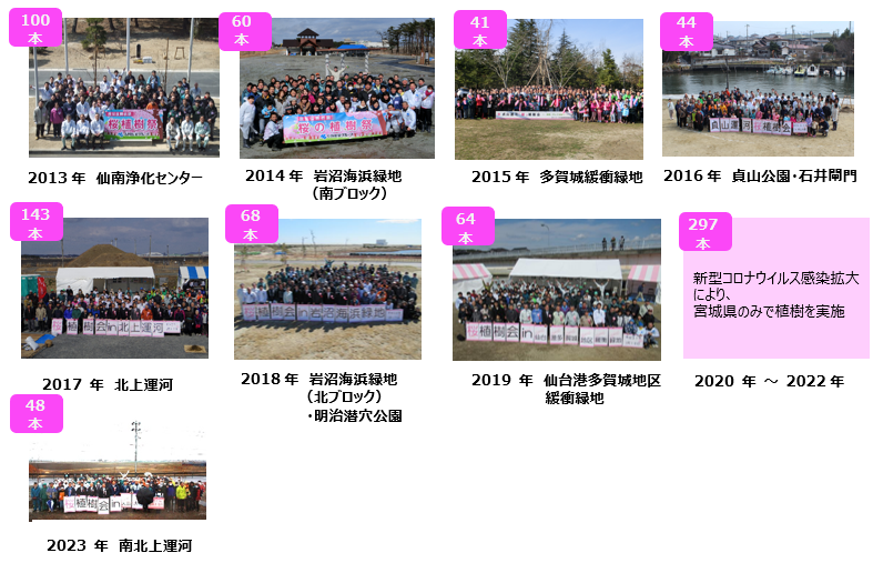 2013年より「震災復興祈願 桜の植樹会」として植樹活動を開始し、2015年から主管を宮城県に移して官民連携で植樹会を開催してきました。毎年3月に、当社社員が市民ボランティアの方々と共に、復興への願いを込めたメッセージプレートを添えた桜の苗木を植樹してきました。
