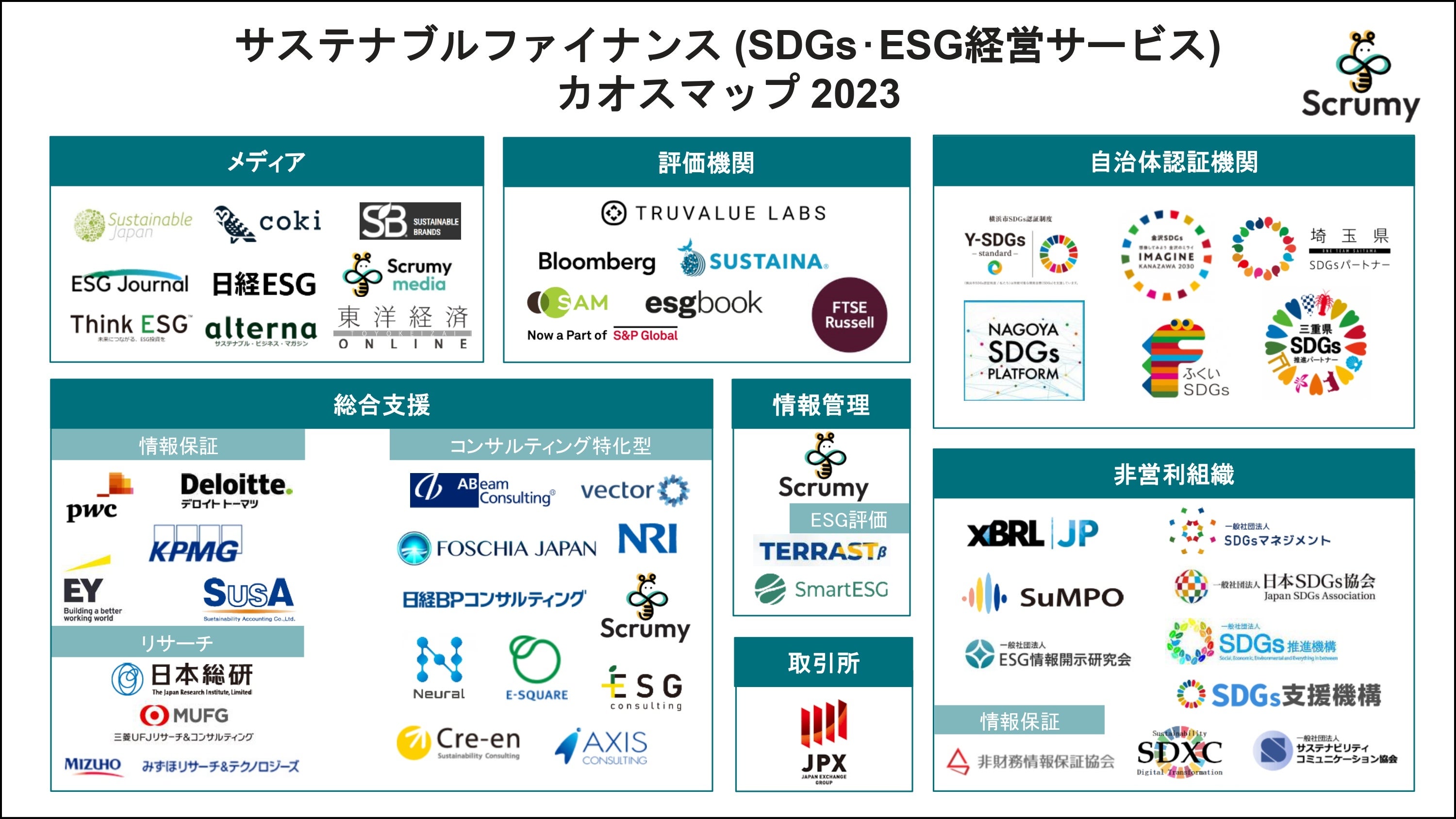 株式会社Scrumy(本社:東京都中央区、代表取締役CEO:笹埜健⽃、以下「スクラミー」)は、2023年3月31日、業界として初めてとなる、サステナビリティ経営を支援するサステナブルファイナンス(Sustainable Finance)業界のサービスやプロダクトを整理したカオスマップを公開しました。