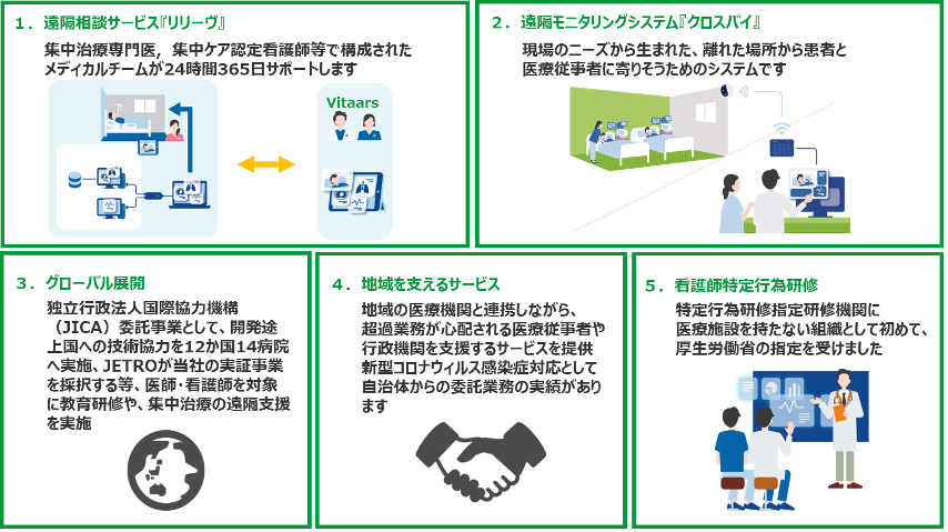 2016年のT-ICU(旧社名)創業以来、遠隔ICUによる診療サポートサービスを中心に医療において幅広く事業を展開、2023年3月よりVitaarsに社名を変更致しました。集中治療科医・集中ケア認定看護師のチームを擁し、医療機関向けに専門性の高いサポートを提供する日本で唯一の事業会社として、「世界中の人々に、最高の医療をAnywhere, we care.」をミッションに、専門知識と経験で医療現場を支え、患者・医療従事者・関わる人々の願いがかなう環境を目指しています。