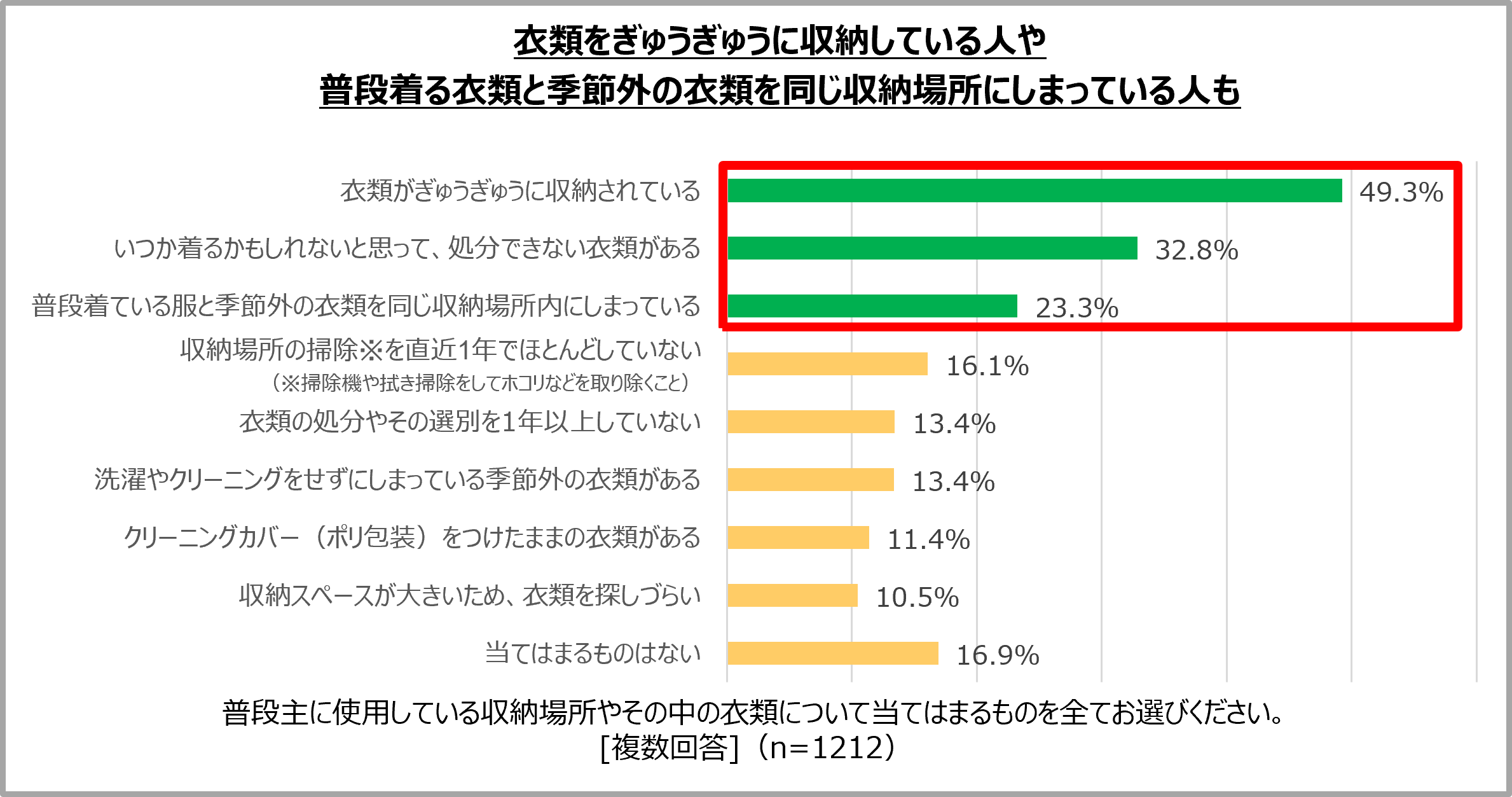 次いで「処分できない衣類がある」「普段着ている衣類と季節外の衣類を同じ場所に収納している」が続き、衣替えと衣類の管理が上手くいっていない実態が見受けられます。