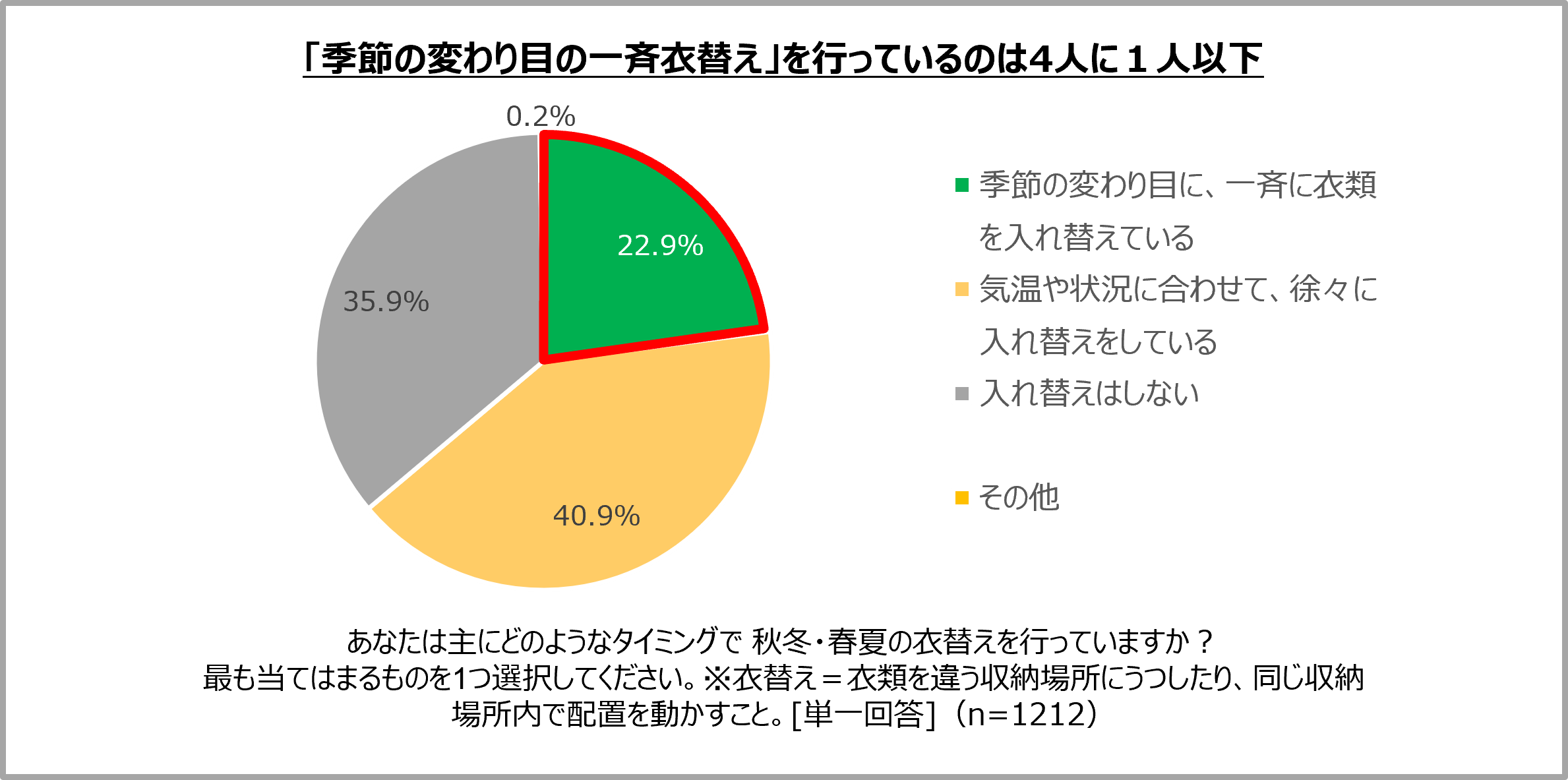 衣替えを行うタイミングについて質問したところ、従来のように「季節の変わり目に一斉に衣類を入れ替えている」と回答した人は22.9%と、4人に1人以下に留まりました。