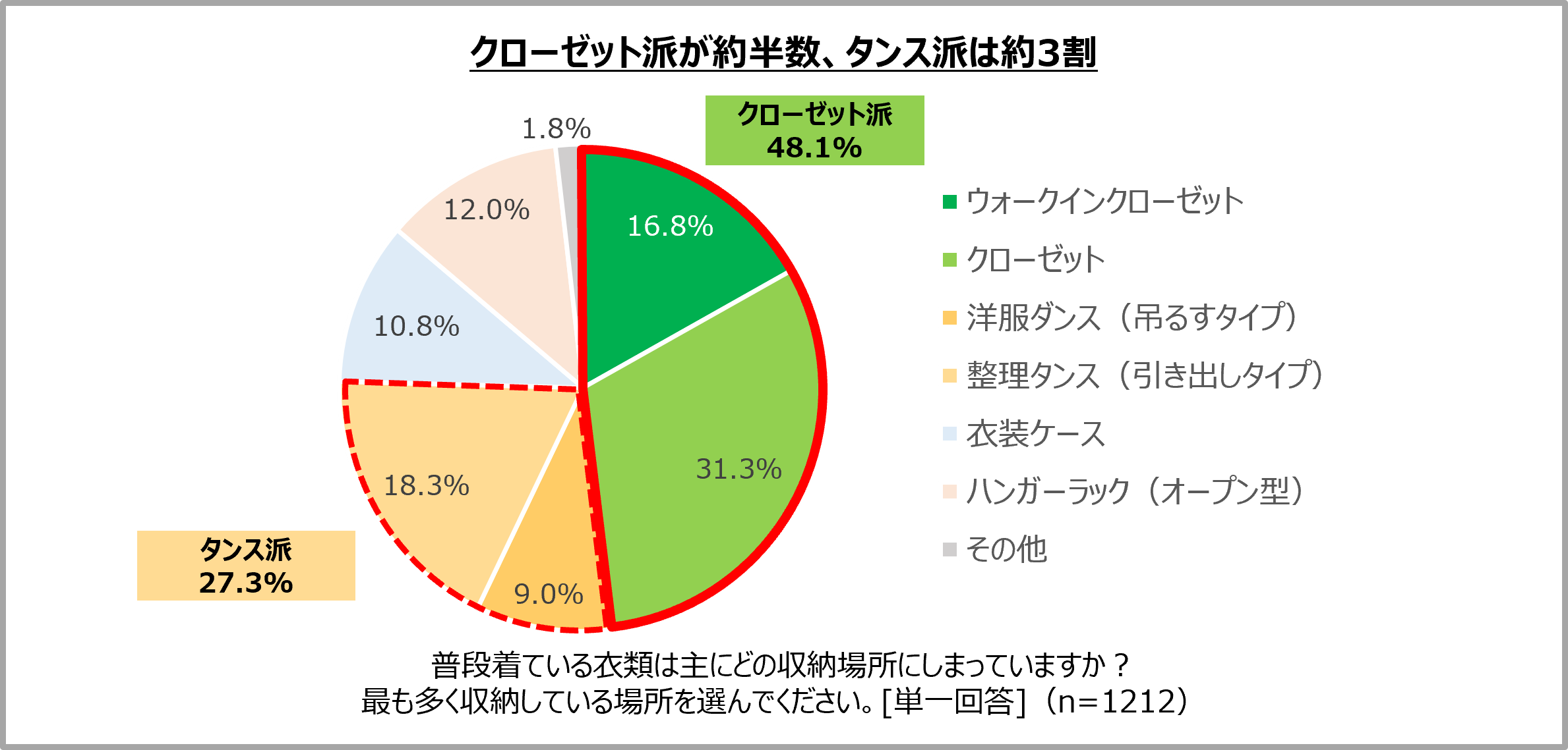 普段着る衣類の収納は、クローゼット派が約半数・タンス派は約3割
