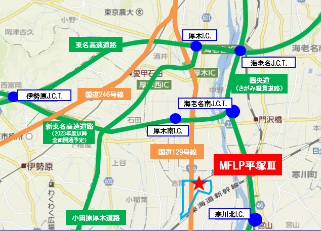 「MFLP平塚Ⅲ」は、最寄りの新東名高速道路「厚木南IC」から約1.4km、東名高速道路「厚木IC」から約3.0km、加えて圏央道へのアクセスも至便で、近郊配送はもとより首都圏、中京圏、近畿圏を結ぶ広域配送にも対応します。