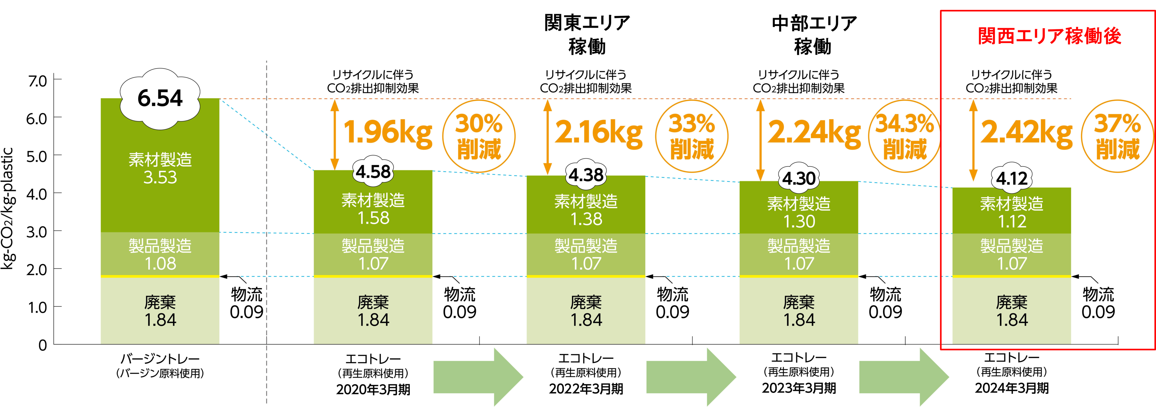この度のPPA締結により、MPSが関西工場・関西ハブセンターに太陽光発電設備を設置し、発電した電力を当社が全量購入いたします。この結果、関西工場・関西ハブセンターの太陽光発電の他、2022年3月に運転を開始した関東エリア及び2022年10月に運転を開始した中部エリアの太陽光発電設備で発電した電力量で、全国3カ所のリサイクル工場で使用する全量相当をカバーすることが可能になります。これにより、再生原料製造工程でのCO2排出量がゼロになることから、石油由来製品と比較したエコトレーのCO2排出削減効果が現状の30%から37%に上昇する見込みです。