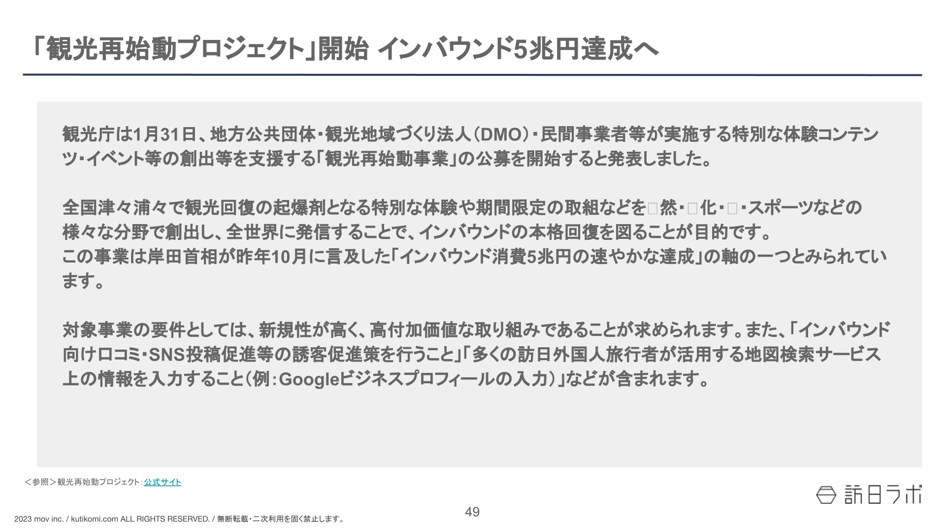 国内最大級のインバウンド総合メディア「訪日ラボ」を運営する株式会社mov(代表取締役:渡邊 誠、本社:東京都渋谷区、以下mov)は、2022年以降のインバウンド関連ニュースを振り返るレポート「インバウンド動向まとめ【2022年1月〜2023年3月】」を公開しました。