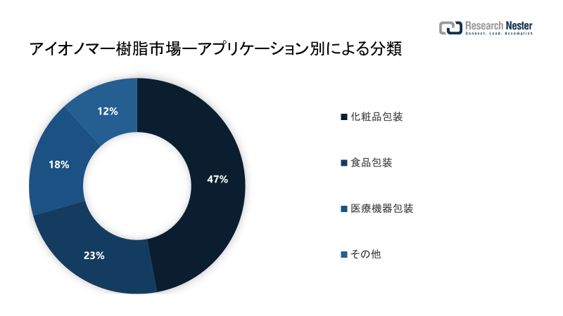 アプリケーションに応じて、アイオノマー樹脂市場は、食品包装、化粧品包装、医療機器包装などに分割され、需要と供給について分析されます。これらのうち、化粧品包装セグメントは2035年末までに最大の市場シェアを保持すると推定されています。市場は、世界中の化粧品生産の増加に支えられて、新しいパッケージングデザインと化粧品に対する需要の増加から恩恵を受けると予想されています。 インドの化粧品市場は、米国およびヨーロッパの化粧品市場の2倍の速さで拡大していることがわかりました。パンデミック前に約9%と推定されていた化粧品包装セグメントの成長率は、2022年から+ 3%増加すると推定されています。