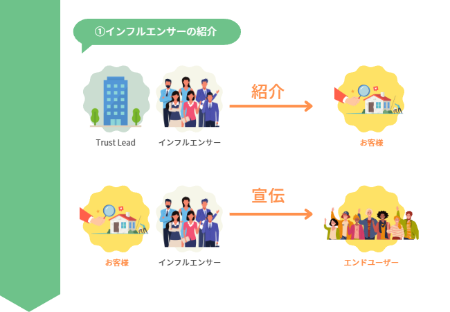トラストカウンター事業をご利用いただくことにより、多くのフォロワーを抱える建築関連の投稿をしているインフルエンサーが、トラストカウンター事業に参入されたお客様のInstagramアカウントやサービスを自身のフォロワーに向けて紹介いたします。