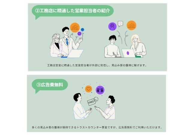 工務店に精通した営業担当者の紹介トラストカウンター事業をご利用いただくことにより、工務店営業に精通した営業担当者がお客様の商品やサービスを外部に発信し、見込み客の獲得に繋げます。自動的に見込み客を紹介する仕組みのため、お客様自身に時間や労力の負担はかかりません。