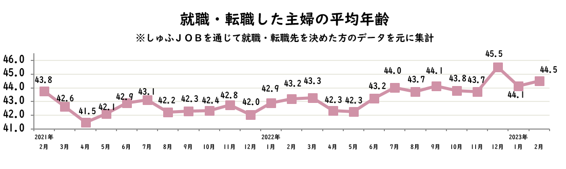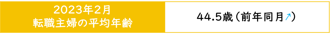転職主婦の平均年齢は、前月比+0.4歳、前年同月比+1.3歳の44.5歳。