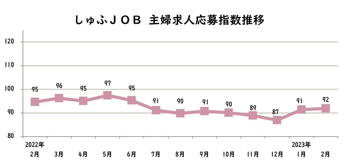 応募指数は前月比+1、前年同月比-3の92。前月に比べ、求人数は微減、応募数は微増した。