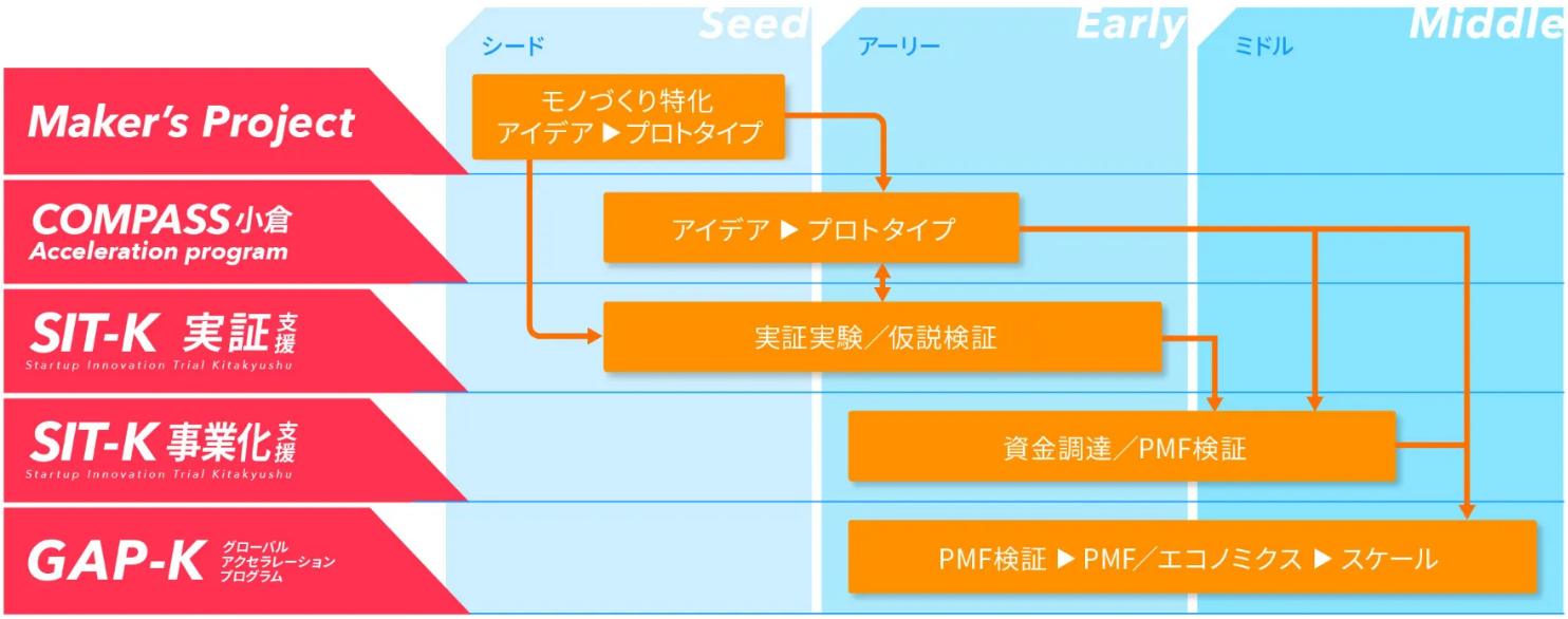このような長い歴史文化や産業学術の醸成を経て、優秀な理工系の学生を多く有する高専・大学群、ものづくり企業クラスター、多様な実証フィールドが形成され、2020年には内閣府のスタートアップ・エコシステム推進拠点都市に採択されました。産学官金で構成する「北九州市SDGsスタートアップエコシステムコンソーシアム」を中心にVCとも連携して、スタートアップの成長フェーズに即した切れ目ない支援を行っています。