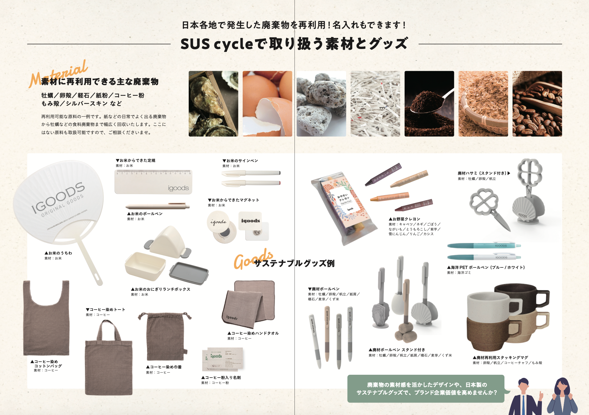 廃棄物を価値あるグッズに生まれ変わらせたグッズをご購入できます。全商品名入れができるため、オリジナル製品づくりを通じて、企業・ブランドの価値向上に貢献します。再生グッズにロゴ入れしたい企業様にオススメです。