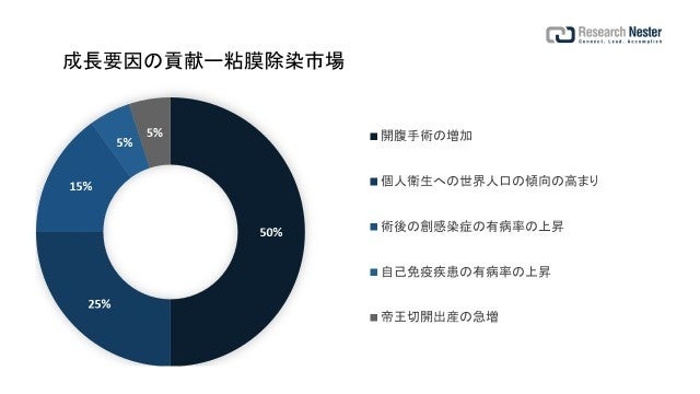 英国では、2019 - 2020 年にかけて約 12,000 件の冠動脈バイパス手術が行われました。2020年には、開腹手術後の合併症の症例が2%増加したことが観察されました。開腹手術では、臓器の全体像を得るために皮膚を切開します。これは、外科医がメスを使用して約 10 インチの切開を行い、感染部分に到達して修復する重要な手順です。開放手術を経験した後、患者は肺塞栓症、出血、深部静脈血栓症、および創傷感染に苦しんでいることが観察されています。したがって、粘膜の汚染除去は、特に創傷感染の治療に有用になります。したがって、この要因は、予測期間にわたって市場の成長にプラスの影響を与えると予想されます。 -