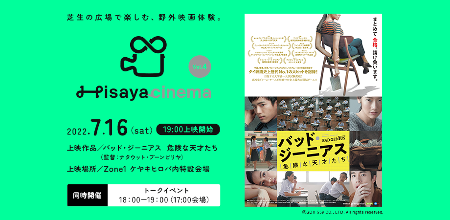 環境問題やさまざまな文化、感性に触れ合うきっかけとなるような映画を上映している「Hisaya cinema」。4回目となる今回は、タイ映画史上歴代ナンバー1の大ヒットを記録した「バッドジーニアス 危険な天才たち」を上映いたします。 タイ料理やクラフトビール、スイーツなど、美味しい料理を満喫しながら、真夏の夜の野外映画館をお楽しみください。