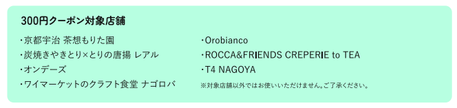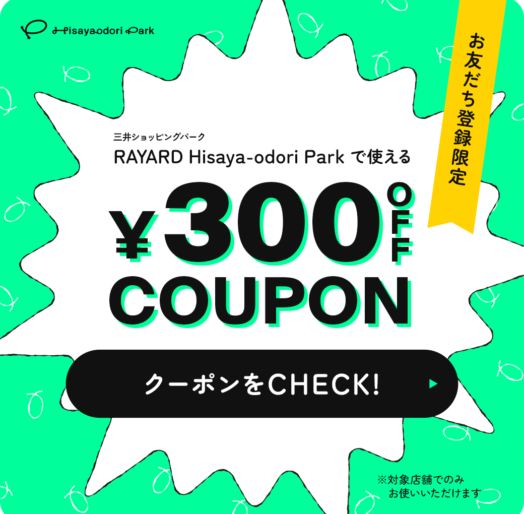 お友だち登録をしていただいた方全員に園内対象店舗で使える「300 円OFFクーポン」をプレゼント。