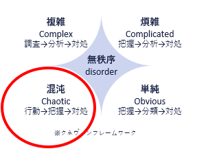 4象限に分かれており、整理できている現象は、単純(右下)、煩雑(右上)複雑(左上)のように分類や分析をすることで対処できますが、混とんとした新しい現象においてはそれができません。行動して把握して対処して積み重ねることを続けていくことになります。