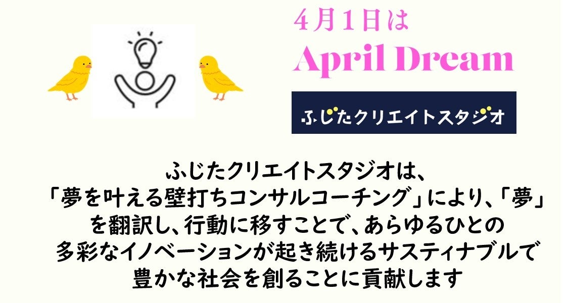当事務所は、4月1日を夢を発信する日にしようとするApril Dreamに賛同しています。このプレスリリースは、当事務所「ふじたクリエイトスタジオ」の夢です。 https://prtimes.jp/aprildream/