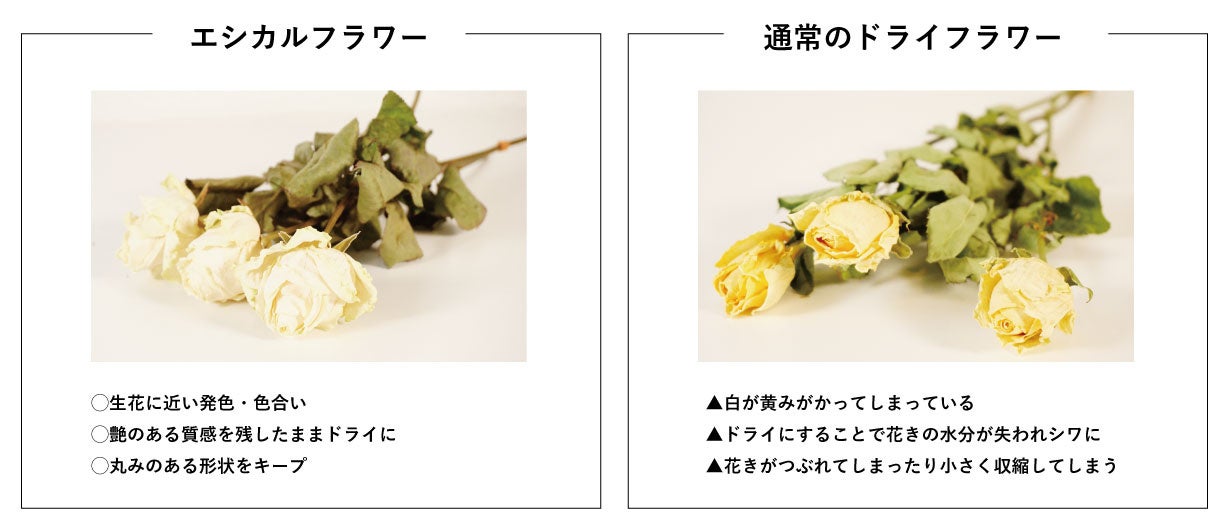 廃棄対象のお花を100%使用し、弊社独自の製造により通常のドライフラワーよりも生花に近い色味を維持し、シワにならず生花のかたちをできる限りのそのままにしています。