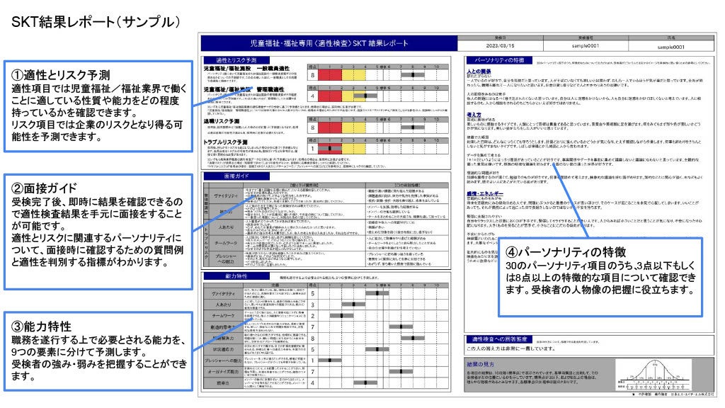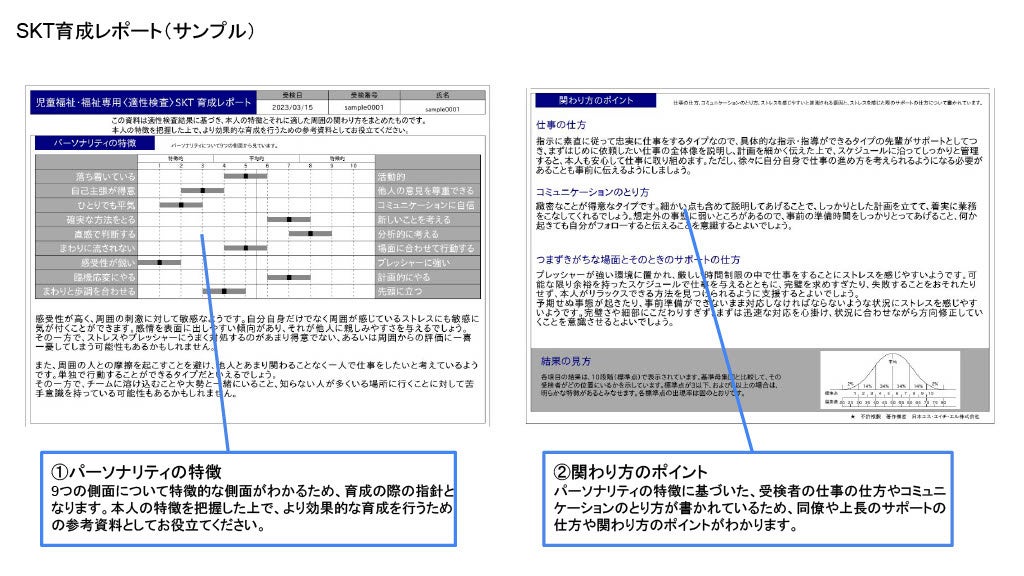 SKTは、児童福祉施設を全国で55教室運営している当社と、年間受検者120万人以上の実績がある日本エス・エイチ・エル株式会社(本社:東京都中野区、代表:奈良 学)が共同で開発した適性検査です。同社グループのパーソナリティ検査「OPQ」をベースに、児童福祉業界で働く上での適性を測る独自の指標を加えた検査により、児童福祉施設の人材採用をサポートします。