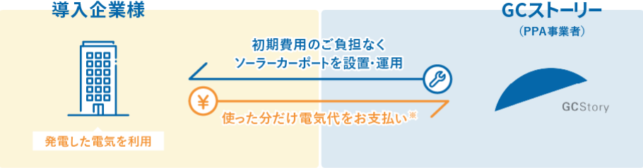 PPA(Power Purchase Agreement:電力販売契約)モデルとは、PPA事業者と契約することで、太陽光発電の設備を初期費用0円・メンテナンス費用0円で導入できる仕組みです。「ソーラーカーポートPPAモデル」では、GCストーリーがソーラーカーポートを無償で設置します。設備の保有はGCストーリーが持つ形となりますので、資産の保有も発生しません。また、メンテナンスもGCストーリーが対応しますので、管理やメンテナンスのコストも一切かかりません。