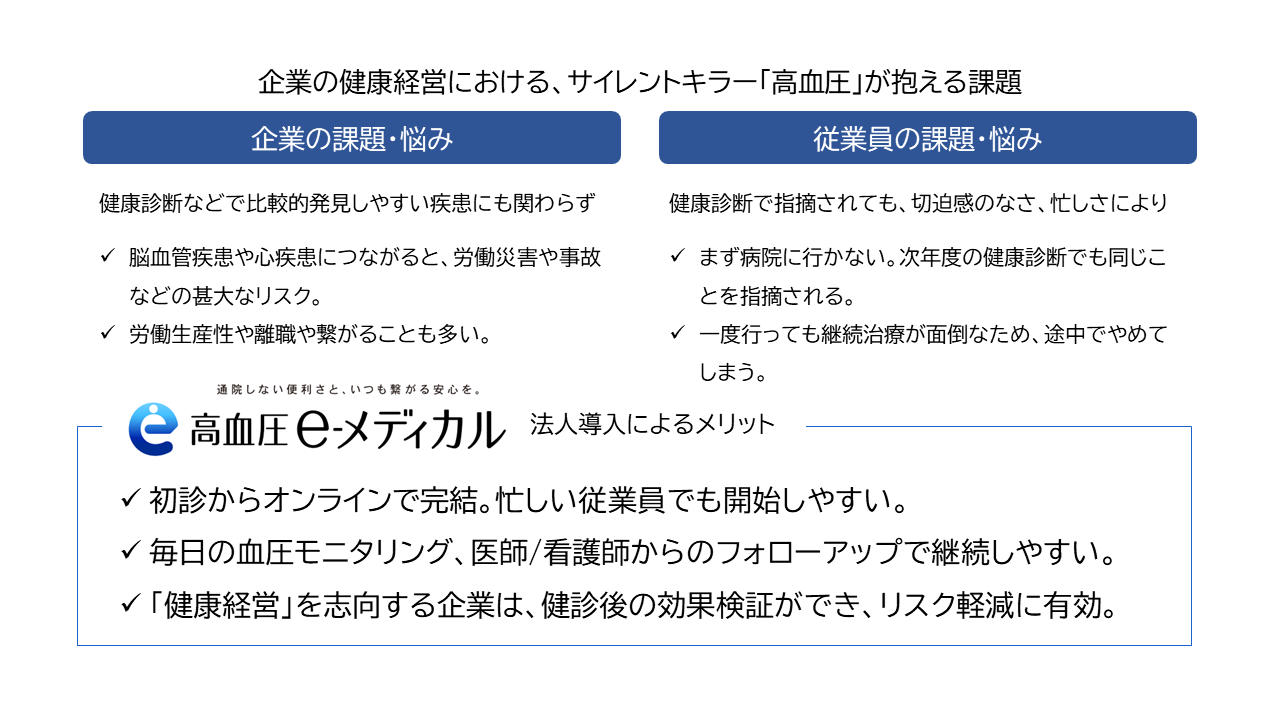 従業員の健康管理を経営戦略上の重点課題として捉える「健康経営」において、脳血管疾患や心疾患といった従業員の命に直結するリスクの最大要因の1つである高血圧は、重要度の非常に高い領域です。「高血圧イーメディカル」は、①初診から通院不要、薬も自宅に届くオンライン診療の利便性 ②高血圧の専門医療チームによる診療 ③アプリと家庭血圧計による継続モニタリングで、高リスクの従業員の治療開始、継続を強力にサポートし、“従業員の命を守る“オンライン診療サービスとして、健康経営の新たな選択肢を提案します。