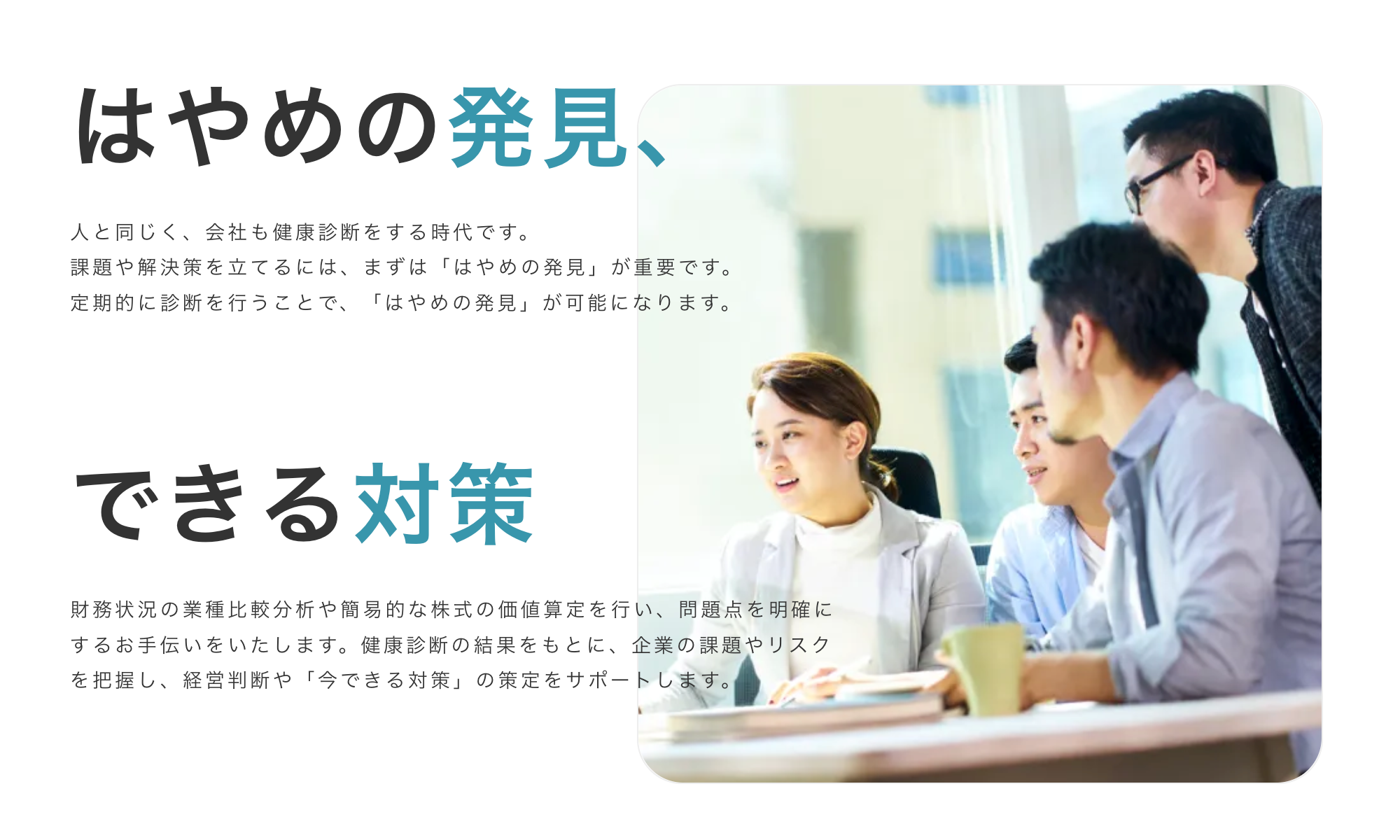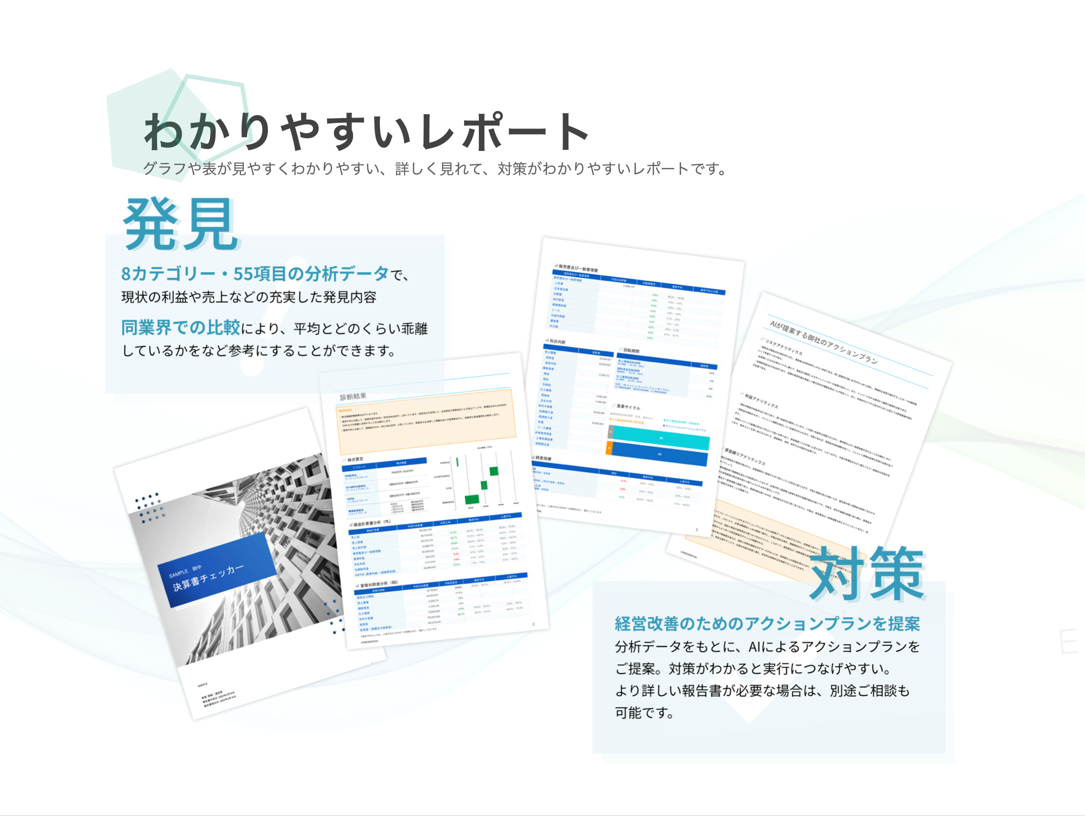 決算書から得られる情報からAIが分析を行い、会社の経営状況の把握に資する情報を提供します。また、各種統計データを用いた業界や上場企業との比較を行い、会社の競争力や市場での立ち位置を明確にします。自社の経営状況の把握、自社と同様の業種との比較分析により今後の経営方針に役立てていただければ幸いです。