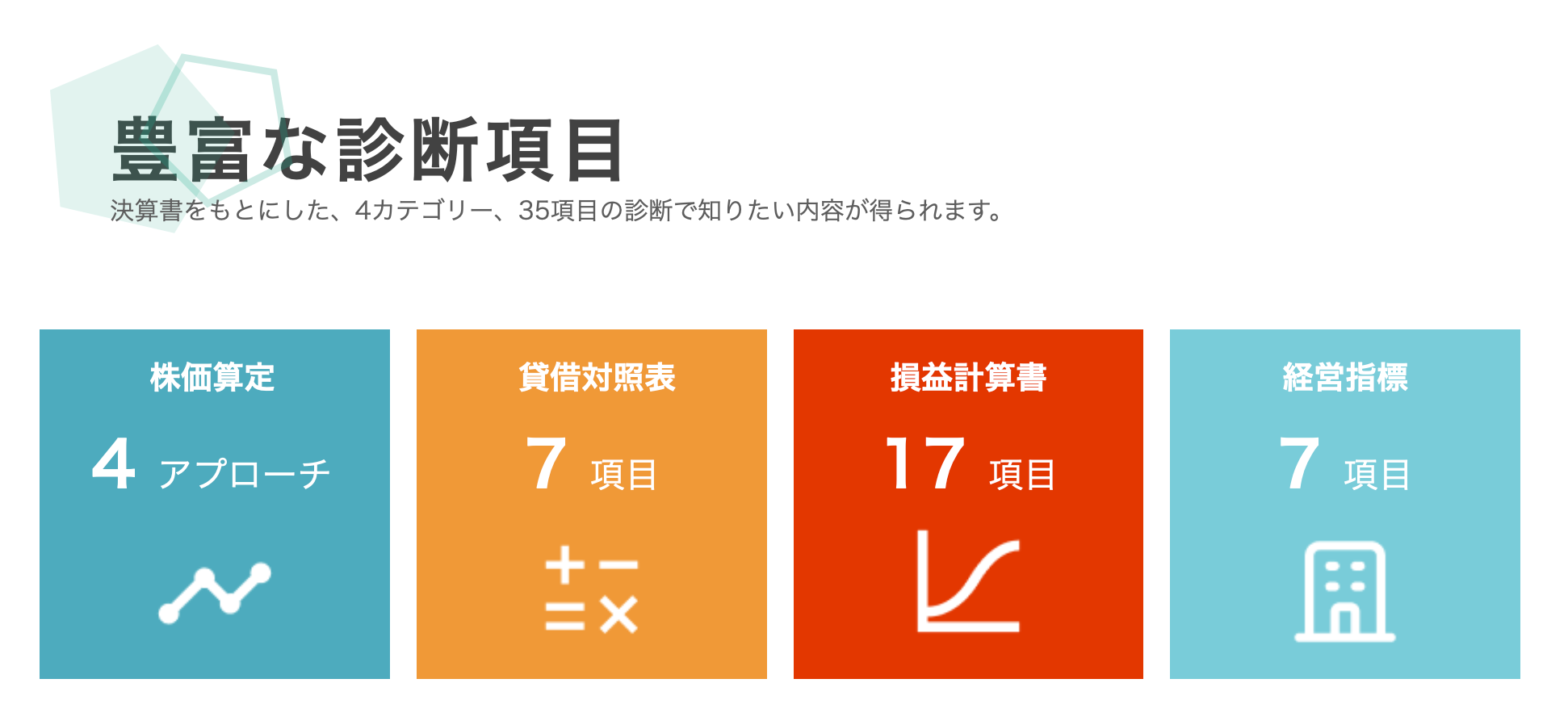 決算書チェッカーでは、会社の財務諸表から将来の収益性に一定の仮説をおいて評価するDCF法、当期純利益を起点に評価するPER倍率法、営業利益を起点に評価するEV/EBITDA倍率法、決算書の純資産額と営業利益から算出する簿価純資産法の算出を行います。