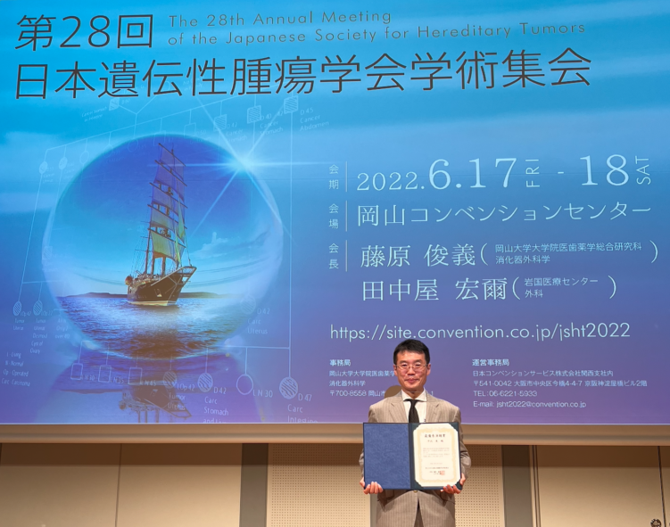 国立大学法人岡山大学(本部:岡山市北区津島中、学長:槇野博史)学術研究院医歯薬学域(医)臨床遺伝子医療学分野教授の平沢晃教授が、2022年6月17(金)~18日(土)に開催された「第28回日本遺伝性腫瘍学会学術集会」で最優秀演題賞を受賞しました。