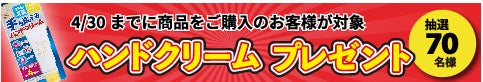 4/30までにサイト内でご購入いただいたお客さまの中から、抽選で70名さまへ『手指の消毒ができるハンドクリーム』 プレゼント!