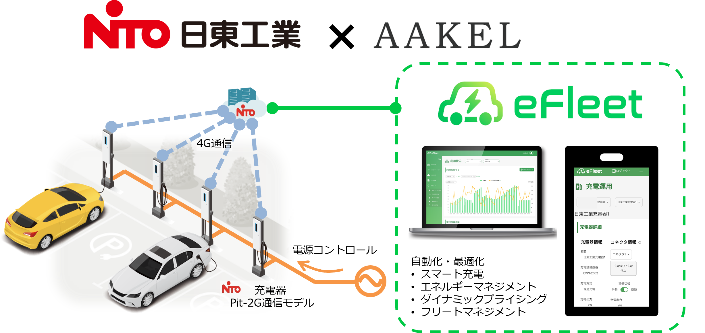 当社は、日東工業株式会社(本社:愛知県長久手市、取締役社長:黒野透、以下、日東工業)のMode3普通充電器「Pit-2G(ピット・ツージー)シリーズ」と「AAKEL eFleet」の連携を発表いたします。