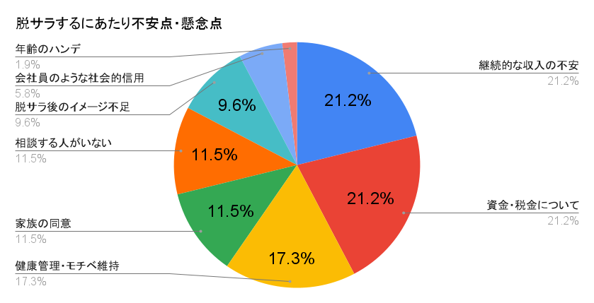 脱サラ経験者に脱サラをしてよかったことをお伺いすると「自由に好きなことだけに取り組める」「収入が増え安定感が出た」「家族や子供との時間を作れる」など脱サラのメリットがたくさんあることがわかります。しかし自由な時間や収入アップが期待できる一方で、脱サラは準備資金や継続的な収入の不安、また脱サラ準備や独立後の相談をする人がいないなど様々な不安があります。