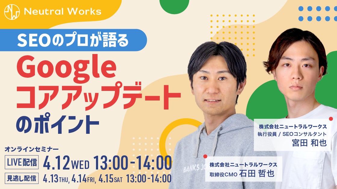 株式会社ニュートラルワークス(神奈川県茅ヶ崎市 代表取締役:三木五月、以下 ニュートラルワークス)は、オンライン無料ウェビナー「SEOのプロが語るGoogleコアアップデートのポイント」を4月12日(水) 13時より実施いたします。