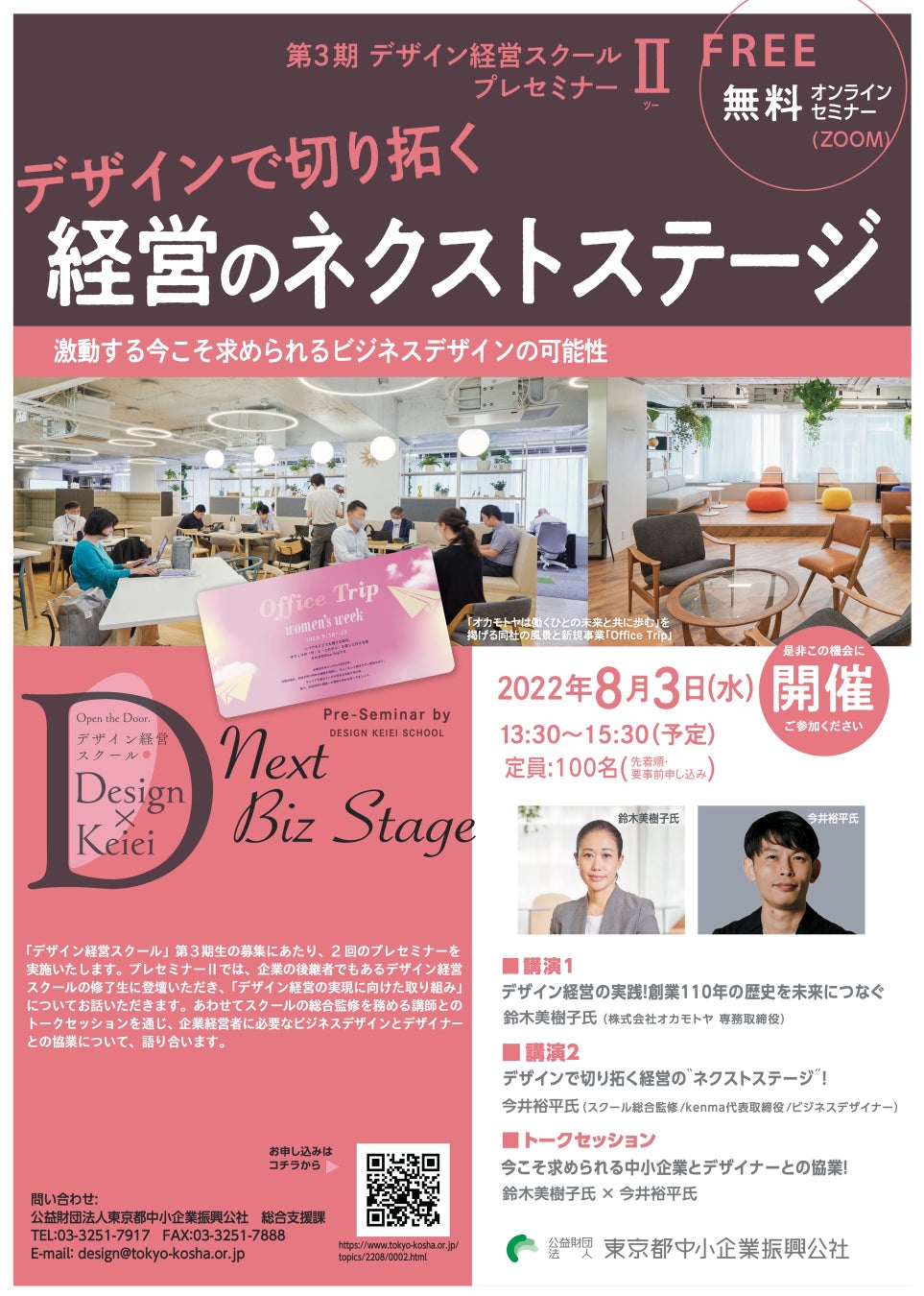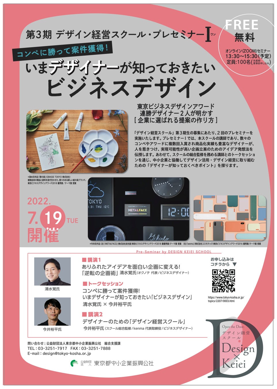 公益財団法人 東京都中小企業振興公社(本社:東京都千代田区、理事長:目黒 克昭)は、デザイナーと中小企業者がデザイン経営について体系的に学ぶ「デザイン経営スクール」第3期生の募集にあたり、本スクールを体験できるプレセミナーを7月19日(火)・8月3日(水)に無料開催します。(各回先着100名・要事前予約)