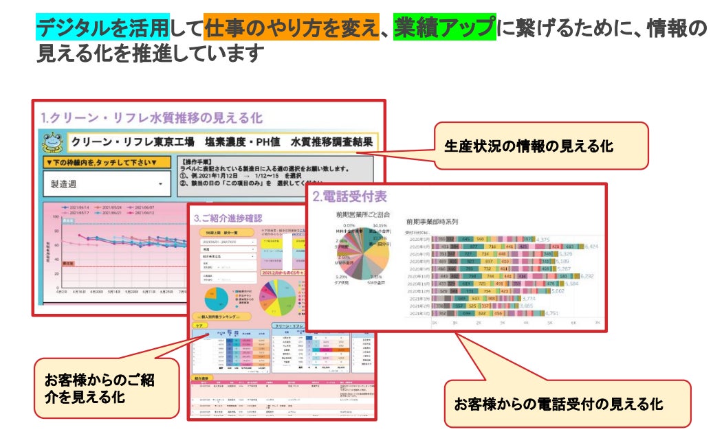 DX推進を更に強化し、掲げたビジョンの実現に向けて取り組んでまいります。Google,Zoho等のBIツールを組み合わせ、可視化した情報(データ)を基にお客様満足度向上を目的とした施策をスピーディーかつ数多く実行できるビジネスプロセスを構築し、目まぐるしく変化し続ける市場環境とお客様ニーズに素早く対応していけるデータドリブン経営を実現してまいります。