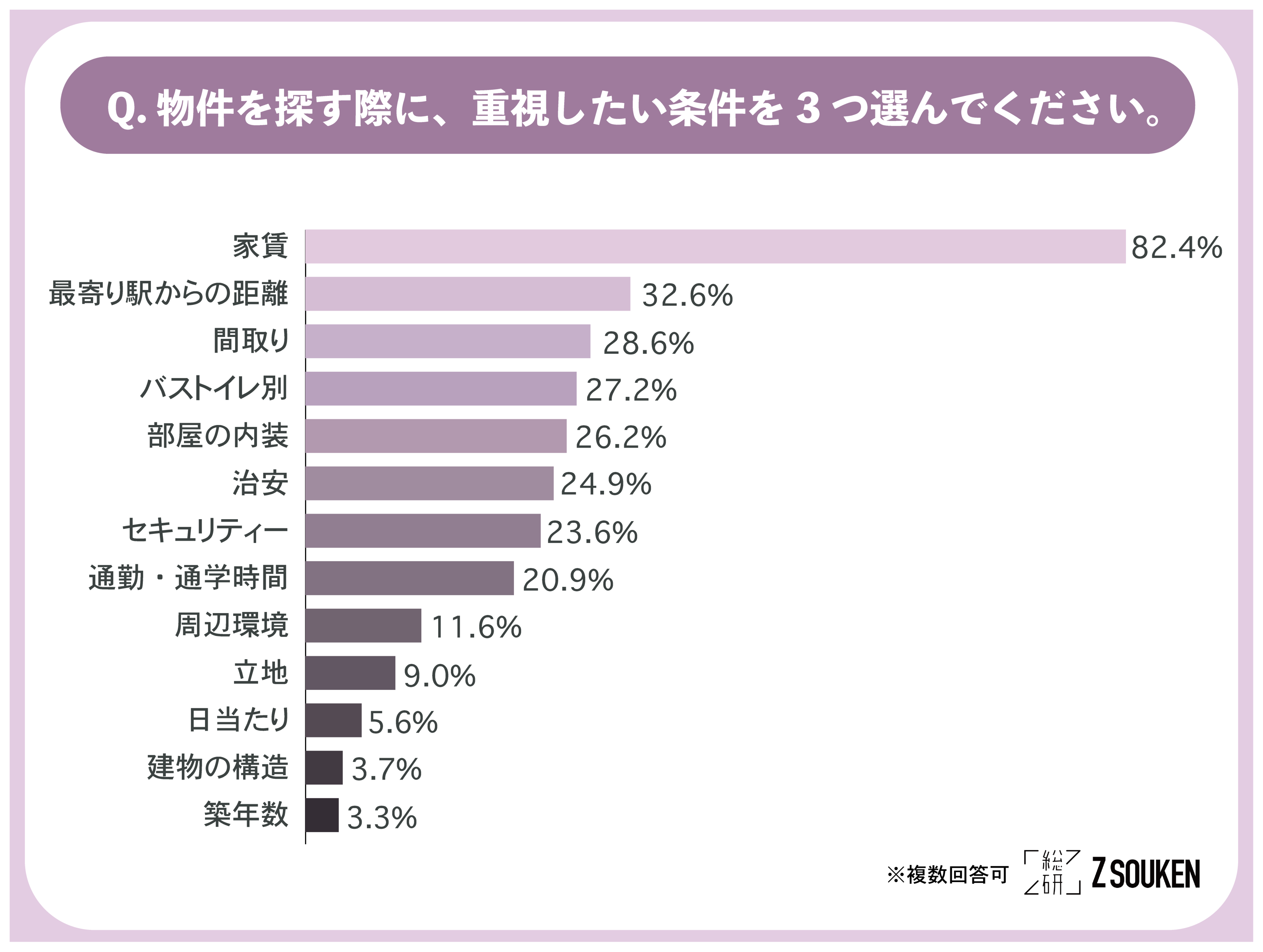 アンケートにて「物件を探す際に、重視したい条件を3つ選んでください。」と尋ねたところ、『家賃(82.4%)』と回答した方が最も多く、続いて『最寄り駅からの距離(32.6%)』、『間取り(28.6%)』という結果になりました。