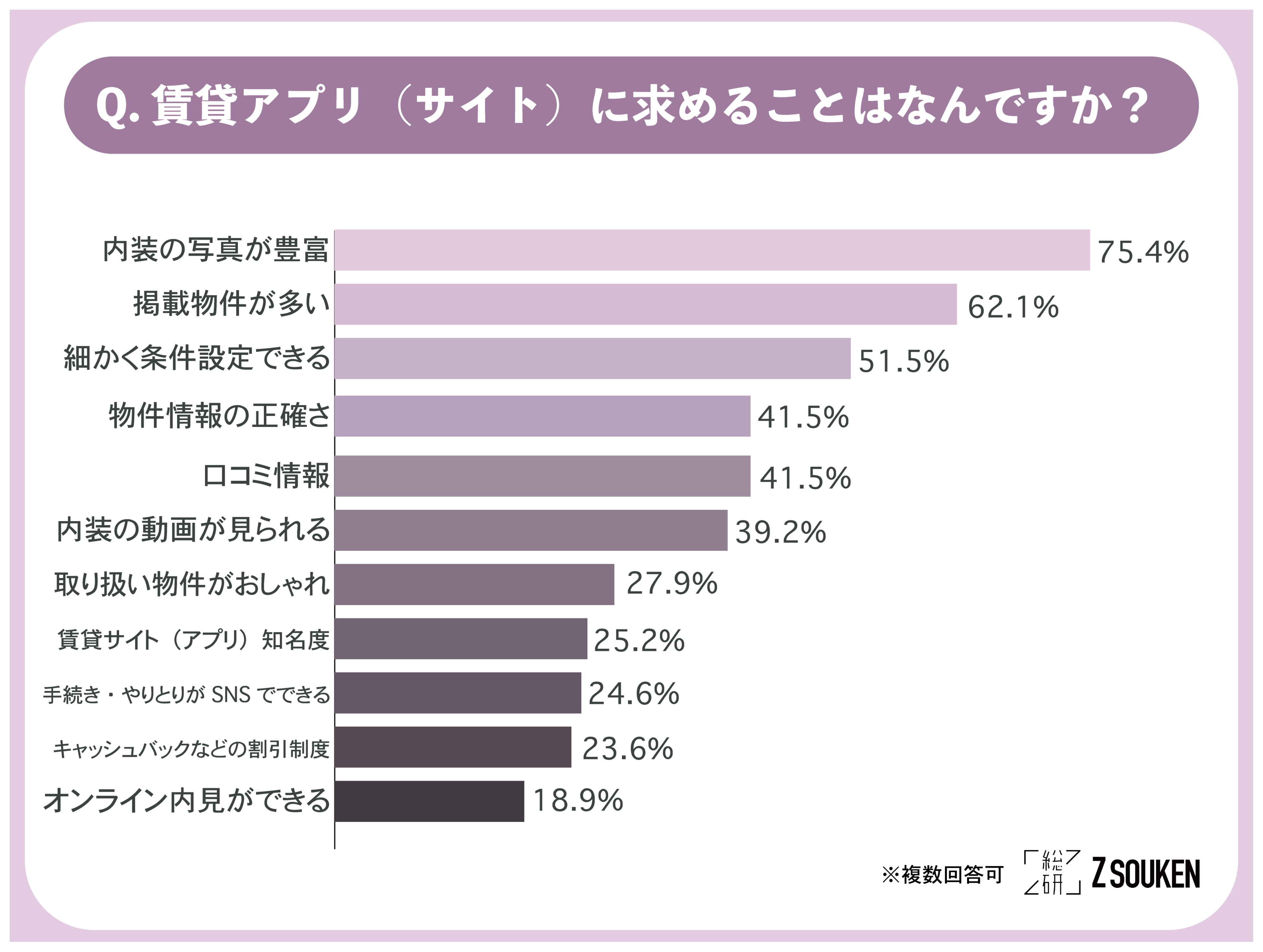 アンケートにて「賃貸アプリ(サイト)に求めることはなんですか?」と尋ねたところ『内装の写真が豊富(75.4%)』と回答した方が最も多く、次いで『掲載物件が多い(62.1%)』、『細かく条件設定できる(51.5%)』、が多い結果となりました。