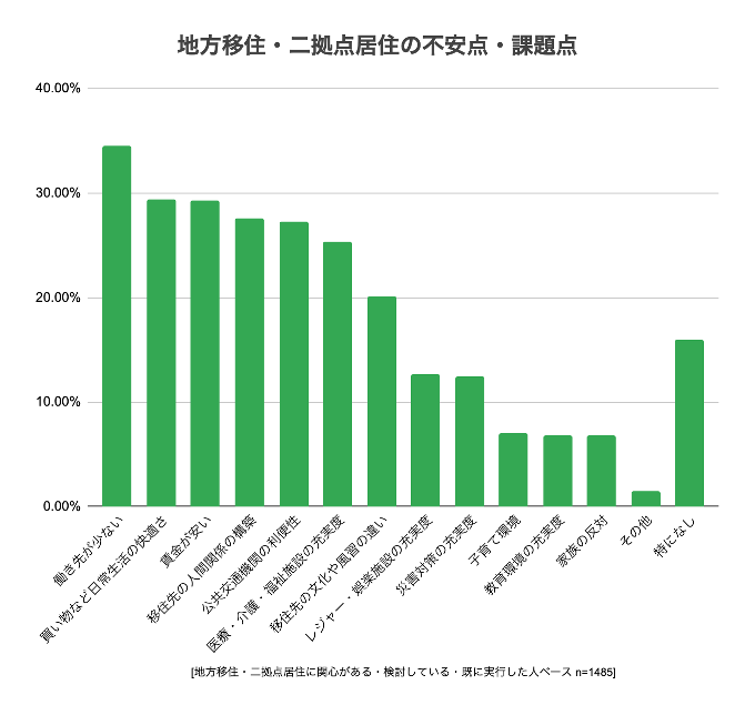 マーケティング・リサーチ会社のクロス・マーケティングが実施した調査によると地方移住・二拠点居住実行の不安点・課題点では「働き先が少ない」が第一位。