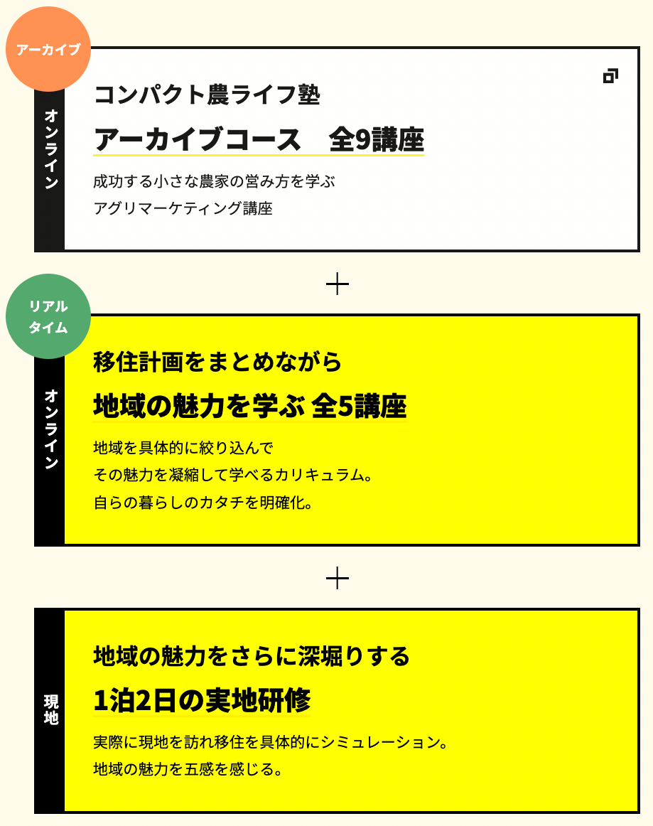 オンラインで農的暮らしと商いのつくりかたを学びながら、現地実習でそれを体現している人々と出会うことができます。オンラインと実地研修を組み合わせることで超短期間ながらノウハウ満載のプログラムを実現しました。