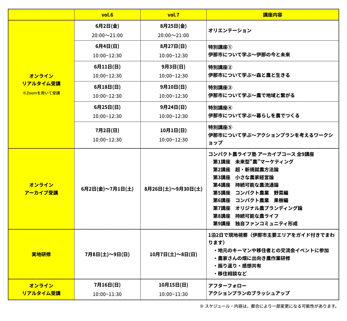 プログラムはオンライン講座を基本としており、第6期では6月2日(金)から7月16日(日)の1.5ヶ月という短い期間で移住・半移住×農ライフを実現することが可能です。長野県伊那市との提携により、伊那市での農のある暮らしを実地研修で体感し、移住に向けたサポートを受けることもできます。受講をご検討の方向けに4月9日(日)より「無料オンライン説明会」「卒業生との座談会&移住相談会」(https://inasta6.peatix.com/)を実施します。