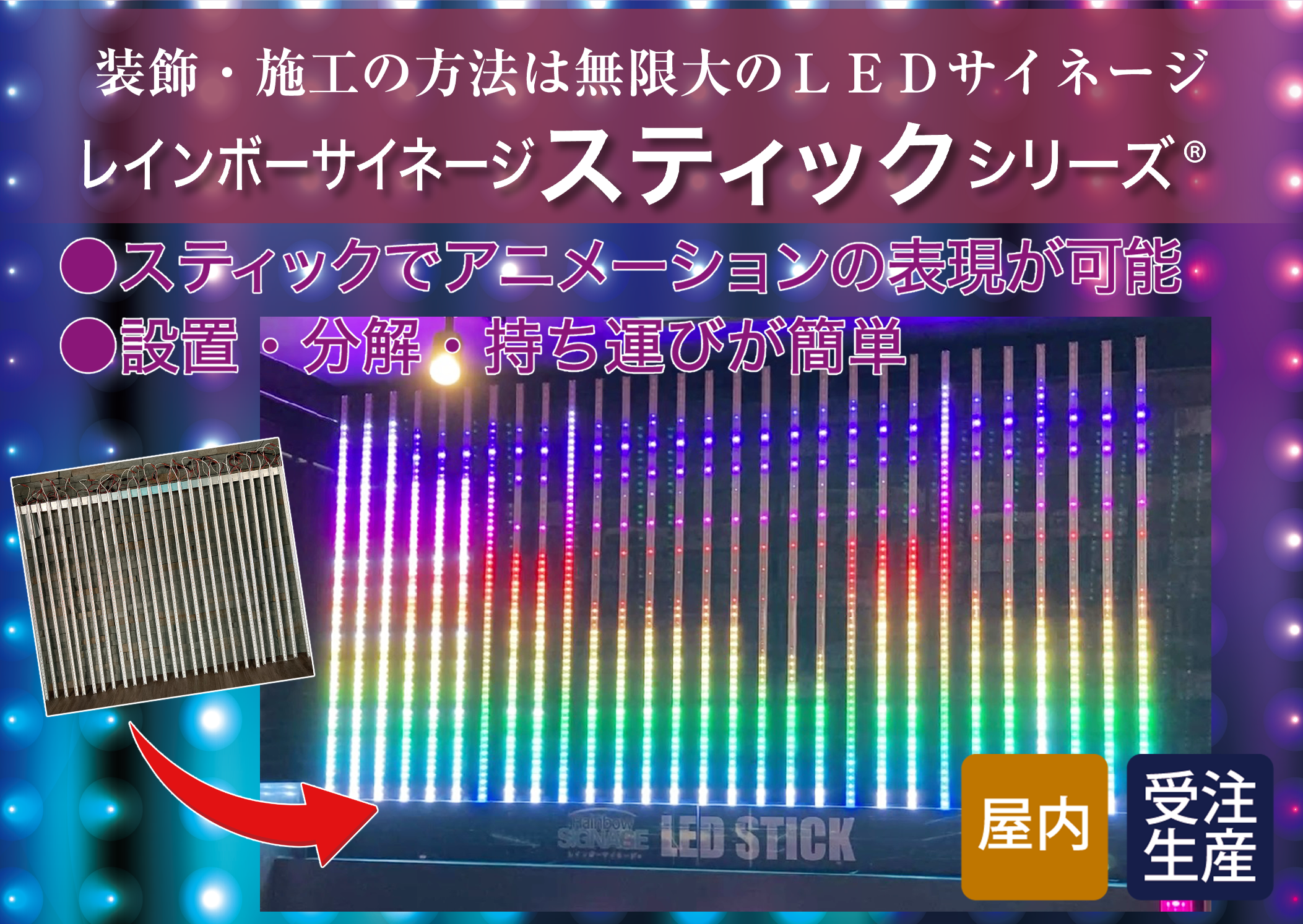 レインボーサイネージ スティックシリーズは、従来のLEDテープライトでは表現出来なかったアニメーション演出が可能なスティック型のLEDサイネージです。シンプルな構造で設置・分解・持ち運びがカンタンなので様々なシチュエーションご活用頂けます。