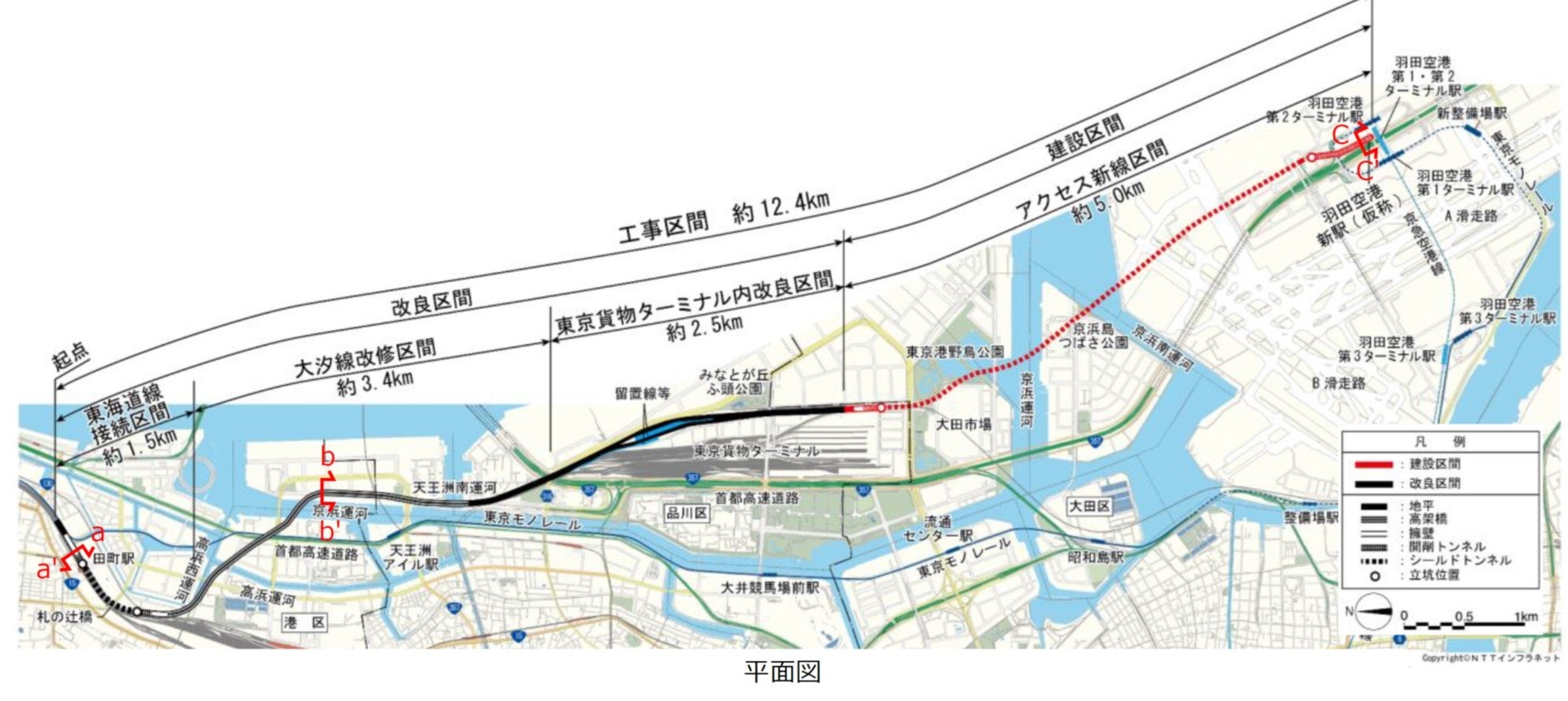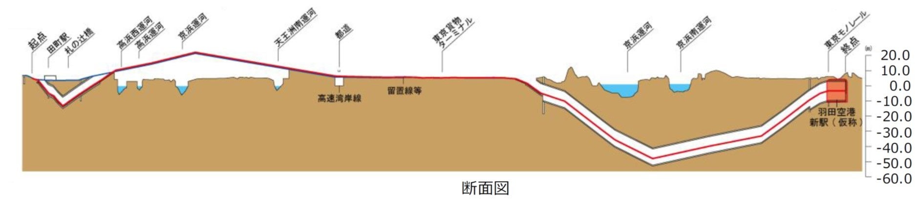 東京貨物ターミナルから公共施設、道路、運河下を通過するルートで、最大深度約50m、延長約4.2㎞の複線シールドトンネルを構築し、羽田空港新駅(仮称)に至る新たな線路を敷設します。
