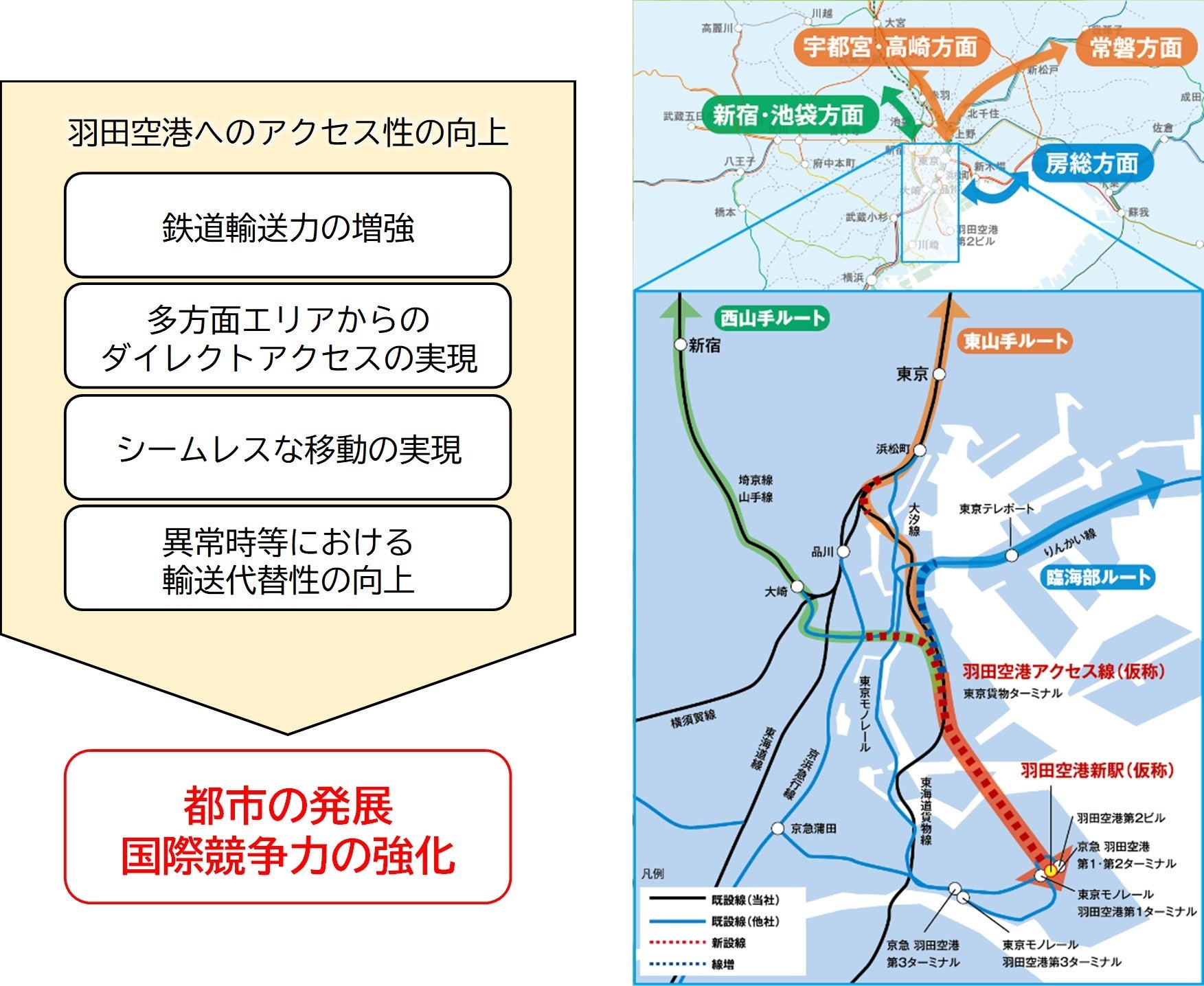 本構想は、2016年4月の交通政策審議会答申第198号「東京圏における今後の都市鉄道のあり方について」において、「国際競争力の強化に資する鉄道ネットワークプロジェクト」に位置付けられ、インバウンド需要のさらなる拡大など、首都空港として重要性が高まる羽田空港の機能強化にも大きく寄与する計画です。