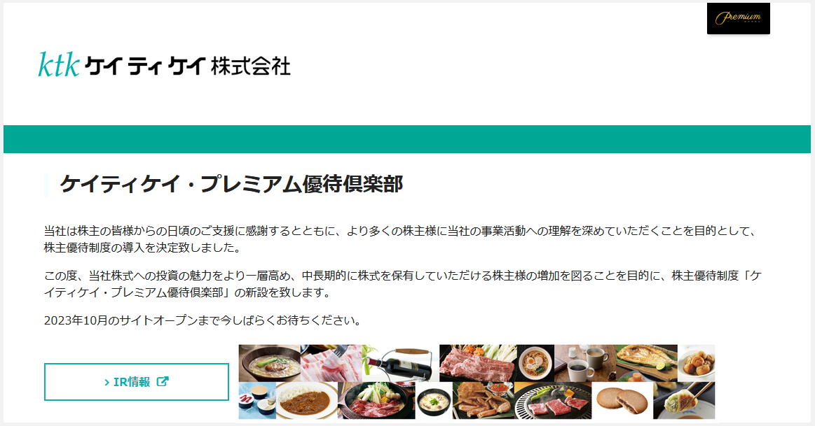 「ケイティケイ・プレミアム優待倶楽部」を新設し、対象となる株主様には、保有する株式数に応じて、お好みの優待商品と交換できる株主優待ポイントを贈呈いたします。