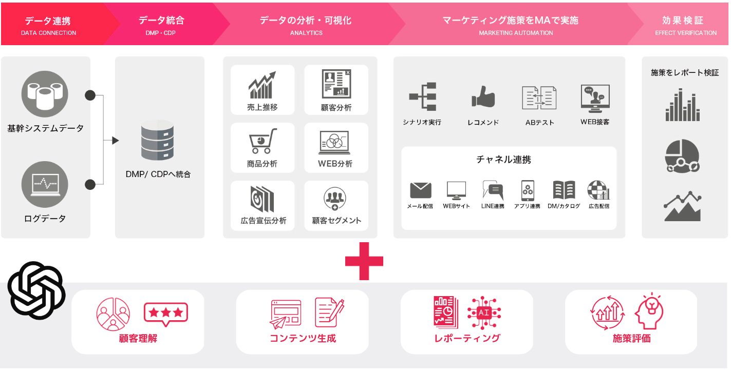背景として、マーケティング業界では急速に進化するAI技術の導入が求められています。また、当社はユーザ様から、データ処理や分析に多大な時間を費やすことで本質的な業務に集中できないとの声が寄せられていました。そこで、当社ではChatGPTやその他のAI技術を利用し、迅速かつ正確なデータ処理や分析を実現することで、クライアントのマーケティング業務を支援することにいたしました。