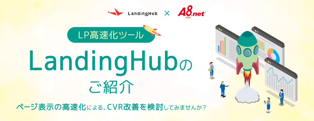 今回の協業販売開始により、手軽に導入いただけるよう、A8.netを初めてご利用いただく新規広告主様へLandingHubを初月1ヶ月無料でご提供させていただきます。