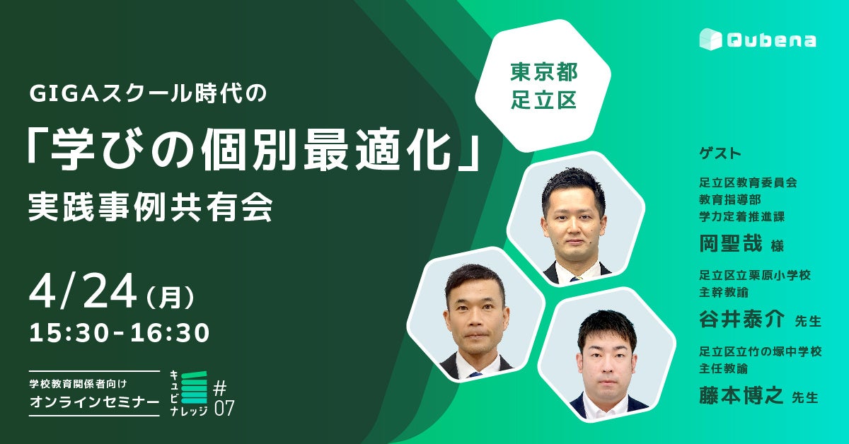 学習eポータル+AI型教材「Qubena(キュビナ)」を開発・提供する株式会社COMPASS(本社:東京都文京区、代表取締役:小川正幹)は、全国の自治体・学校教育関係者向けに、ICT教材を活用した「学びの個別最適化」の実践事例を紹介するオンラインセミナー「キュビナレッジ(Qubena×Knowledge)」第七弾を、東京都足立区をゲストに迎えまして4月24日(月)に開催することをご報告いたします。